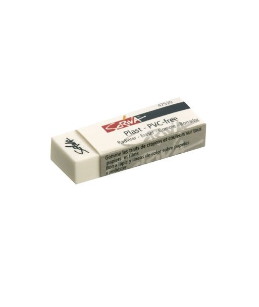 De plástico branco, suave, versátil não abrasiva. ¶Para apagar todo o tipo de superfícies. Não estraga o papel.¶¶Tamanho: 62 x 21 x 11,5 mm ¶Isenta PVC¶¶