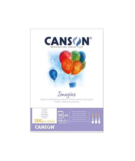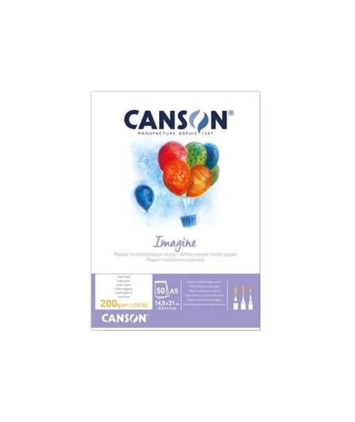 Bloco de Desenho Canson Imagine¶¶Imagine é um papel para técnicas mistas que oferece um toque excelente, um meio termo entre seda e veludo. Possui um aspeto branco natural bonito. ¶¶Ideal para ser usado com grafite, canetas de feltro e marcadores. ¶Também serve para outras técnicas húmidas como aguarela, guache, tinta ou mistura de técnicas secas com húmidas. ¶O seu tom e o seu aspeto levemente granulado permite contrastes e reproduções delicadas e fortes.¶¶Bloco A5 de Grão fino 200gr¶14,8x21 cm ¶50 folhas¶¶Certificação FSC¶Livre de ácido¶Não tem quaisquer aditivos óptico branqueadores¶