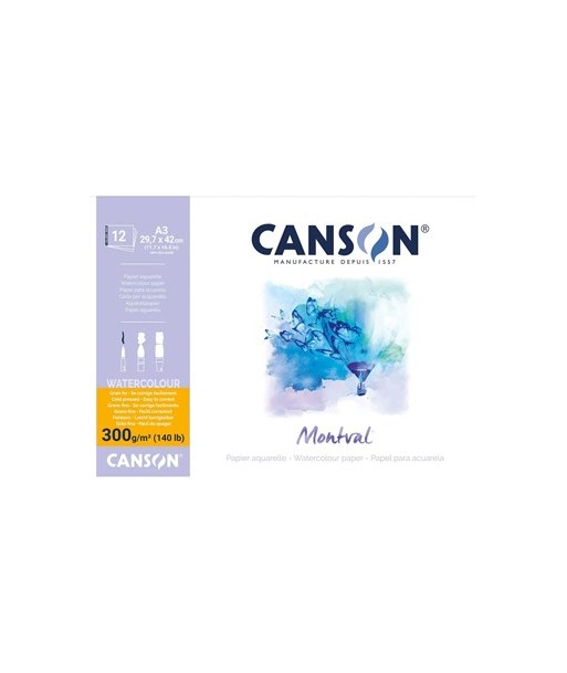 Bloco Colado Canson Montval® ¶¶O papel Canson® Montval® foi concebido pelo pintor Gaspard Maillol, sobrinho do escultor Aristide Maillol e começou a ser fabricado pela Canson® a seu pedido no início do século XX.¶Desde então, o papel adquiriu novas qualidades. Sem ácido, com uma excelente longevidade, tratado contra o bolor e sem aditivos de branqueadores óptico, este é o melhor papel de estudo a aguarela disponível no mercado.¶¶É muito fácil de utilizar e fazer correções (o papel pode ser lavado com um pincel), removendo qualquer vestígio de aguarela.¶Suporta correções com lâminas sem enrugar. ¶É recomendado para todas as técnicas húmidas: aguarela, guache ou acrílico. ¶Muito acessível, particularmente recomendado para principiantes. ¶¶Bloco de grão fino 300g ¶297x420mm ¶12 Folhas¶¶Certificação FSC (apenas blocos)¶Está em conformidade com a norma ISO 9706¶