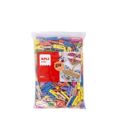Mini pinças de madeira no tamanho 25 x 3 mm em cores sortidas: amarelo, laranja, rosa, lilás, azul claro, azul, verde e natural. Cada bolsa contém 450 mini-pinças.¶Formato MAXI, ideal para escolas.¶Ideal para decorar e guardar cartões, fotos, parabéns, presentes, bolsas, cartões postais, notas, criar guirlandas ... Use-os para adicionar um toque de cor em casa, escola, festas, casamentos, batizados, etc.