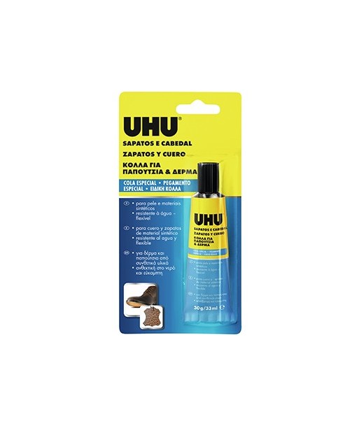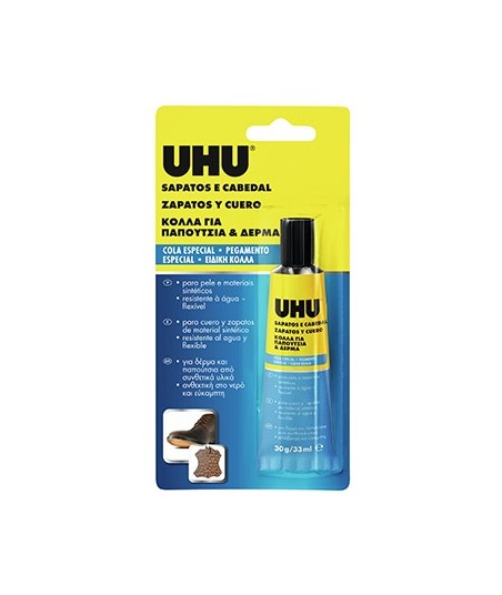 A colagem mantém-se flexível: equilíbrio da tensão do material.¶¶PROPRIEDADES¶cola especial de colagem rápida e flexível¶para colagem de cabedal e borracha, também em combinação com outros materiais¶a colagem mantém-se flexível: equilíbrio da tensão do material¶¶APLICAÇÃO¶CAMPOS DE APLICAÇÃO¶Cola cabedal, borracha, espuma flexível, tecido, feltro, cortiça. Ideal para reparar solas gastas, saltos e buracos dos lados e na parte de cima de quase todos os tipos de sapatos e botas - também para cintos.¶¶NÃO ADEQUADA PARA¶Não adequada para usar com Styrofoam® (esferovite), PVC macio, polietileno e polipropileno.¶¶MANIPULAÇÃO¶Antes o uso:¶Aplicação¶aprox. +15 °C e +30 °C¶¶Requisitos da superfície¶A superfície deve estar seca, limpa e isenta de pó e gordura.¶¶Durante o uso:¶Instruções de utilização¶- Método de aplicação: ¶- a) Método de contacto: Aplique a UHU Sapatos e Cabedal uniformemente a ambas as peças a colar usando uma espátula denteada ou um pincel de pelo curto. Aplique várias vezes em materiais muito absorventes (cabedal, tecido, feltro, etc.) até que permaneça visível uma película de cola. Mantenha as peças separadas até que a camada de cola esteja seca ao toque (isto demora 10-15 minutos, dependendo da temperatura). Depois junte as peças na posição exata e comprima-as muito firmemente uma contra a outra por um curto intervalo de tempo. Não é possível fazer correções. A firmeza da colagem depende da pressão que for exercida e não do tempo durante o qual é exercida  poucos segundos são suficientes. Se as peças foram aplicadas corretamente o conjunto pode ser usado imediatamente. ¶- b) Método da reativação por calor: Este método é recomendado quando ambas as peças a colar requerem um grau elevado de resistência inicial de colagem. A utilização deste método também produz colagens mais resistentes ao calor. Aplique a cola em ambas as peças do conjunto, como para o método de contacto (ver acima). Deixe secar completamente. Depois disso, a qualquer momento, coloque as peças na sua posição exata e proceda à colagem aplicando calor entre +120 ºC e +150 ºC (usando uma lâmpada de infravermelhos de pressão a quente ou um jato de ar quente, para peças pequenas pode usar um ferro de engomar). Quando usar este método deve ter em atenção que a temperatura requerida deve chegar às juntas de colagem. Com este método de colagem não é possível reposicionar as peças. Se as peças a colar estão sujeitas a tensão (curvas, sobreposições, etc.), o conjunto deve ser mantido na sua posição enquanto as peças arrefecem até à temperatura ambiente. ¶- c) Método da reação do solvente: Este método é recomendado se for necessário alargar o tempo de trabalho para além dos 30 minutos, por exemplo, para preparar as peças ou para as armazenar temporariamente e retomar a montagem mais tarde. Aplique a cola em ambos os lados do conjunto, como para o método de contacto (ver acima). Deixe secar completamente. A montagem pode ser efetuada em qualquer altura depois disso, limpe uma das superfícies com um pano que não largue pelos embebido em solvente e comprima as peças de imediato muito firmemente. Os solventes adequados para a reativação incluem a metil-etil-cetona (MEK ou butanona), o acetato de butilo ou diluentes nitro. Temperaturas baixas e humidade elevada aumentam o tempo de endurecimento da cola e, assim, é mais difícil conseguir uma boa colagem.¶¶Conselho¶Diluição: Se necessário, a UHU Sapatos e Cabedal pode ser diluída. Os produtos adequados para este fim são UHU removedor de cola, diluentes nitro e acetato de butilo. Não deve adicionar mais de 10%, caso contrário as propriedades adesivas do produto serão alteradas.¶¶Pontos a ter em conta¶A UHU Sapatos e Cabedal contém solventes voláteis e altamente inflamáveis, devem por isso ser tomadas precauções durante a aplicação e o armazenamento. Certifique-se de que existe ventilação adequada quando efetuar aplicações em grandes superfícies.¶¶Após o uso:¶Manchas/resíduos¶Os resíduos de cola podem ser removidos e o equipamento pode ser limpo usando metil-etil-cetona (MEK ou butanona).¶¶Condições de armazenamento¶Armazenar numa embalagem bem fechada num local seco, fresco e ao abrigo do frio extremo.¶¶ESPECIFICAÇÕES TÉCNICAS¶Base química: Policloropreno¶Resistência a produtos químicos: Água, óleo, ácidos e alcalinos diluídos¶Cor: Amarelo¶Consistência: Líquida¶Densidade ca.: 0,89 g/cm³ ¶Elasticidade: Muito boa¶Resistência final da colagem depois: 24 horas¶Temperatura mínima de aplicação: 15 °C¶Temperatura máxima da aplicação: 30 °C¶Resistência à temperatura mínima: -40 °C¶Resistência à temperatura máxima: 100 °C¶Resistência à humidade: Boa¶Tempo de abertura ca.: 10-40 minutos. Pode variar consoante circunstâncias específicas, como a materiais, temperatura e a humidade.¶Tempo de pressão (+20ºC): 2-5 segundos, com alta pressão de contato¶Resistência a raios UV: Muito boa¶Viscosidade ca.: 3500 mPa·s¶Resistência à água: Boa¶