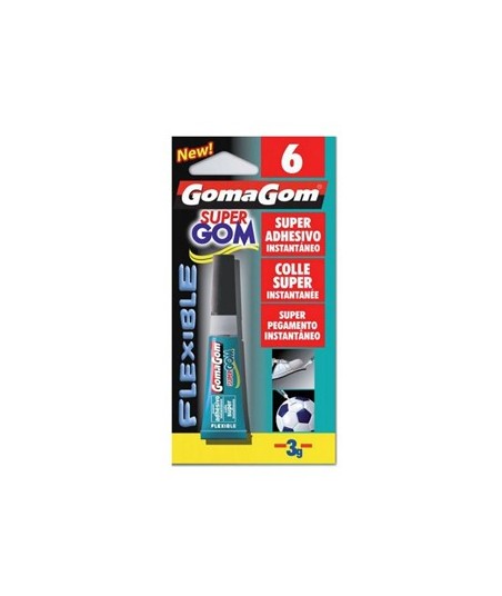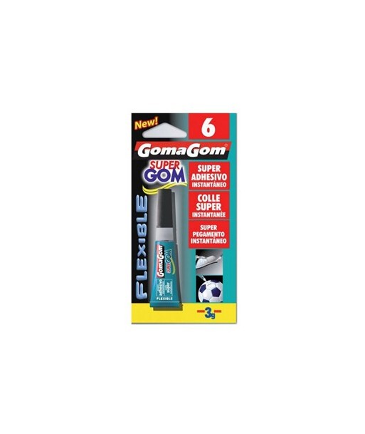 Super cola GomaGom Flexible instantânea de 3g, enriquecida com partículas de borracha. ¶¶Ideal para colagem de materiais flexíveis. ¶Adequada para plásticos, cerâmicas, madeiras, porcelana, mármore, metais, vidro, marfim, entre outros materiais.