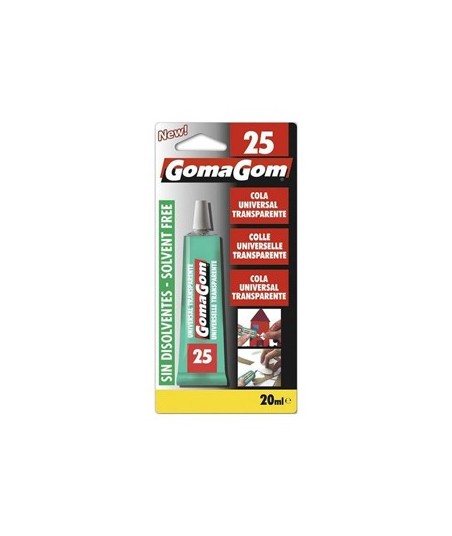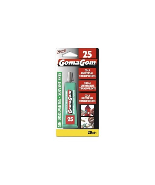 Cola Universal Transparente GomaGom de 20mL sem solventes. ¶Cola firmemente duas superfícies que necessitem de permanecer unidas indefinidamente. ¶¶Poderá fazer uniões e reparações firmes e duradouras em casa, no escritório e na indústria.