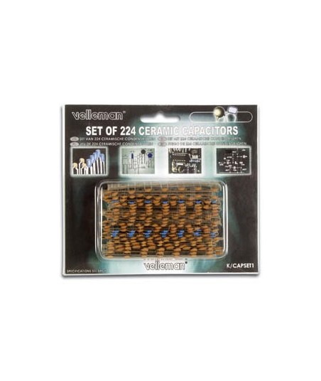 Quantidade: 224 peças¶Número de valores: 14 (a partir de 10pF para 220nF)¶¶Conteúdo:¶21 x: 10pF, 100pF, 1nF, 10nF, 100nF¶14 x: 22pF, 47pF, 220pF, 470pF, 2.2nF, 4.7nF, 22nF, 47nF¶7 x: 220nF¶¶Tipo de embalagem: Blister cartão