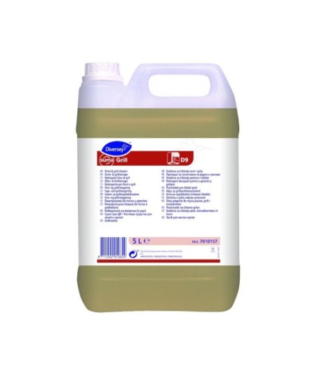 ! Pode usar com o Kit de Pulverização Ref: 6837516572¶¶Suma Grill D9 é um detergente para a remoção de sujidade difícil, indicado para a manutenção periódica de zonas de grande acumulação de gordura em áreas de processamento alimentar.¶¶Suma Grill D9 é um detergente altamente alcalino adequado para a limpeza periódica de fornos, grelhas e salamandras muito sujas. Esta mistura de alcalinos, tensoativos e solventes remove até os resíduos muito carbonizados. ¶Diluído em água, o produto pode ser utilizado para limpeza pelo método de imersão de fritadeiras.¶¶Instruções de utilização¶Limpeza de fornos / grelhas:¶1.  Certificar que a temperatura da superfície é inferior a 80 ºC (ideal 60 ºC a 80 ºC). ¶2.  Pulverizar o produto puro diretamente na superfície ou no equipamento (utilizar o pulverizador de espuma com lança recomendado). ¶3.  Deixar atuar 5 a 30 minutos, dependendo do nível de sujidade. ¶4.  Remover a sujidade solta com um esfregão ou uma escova. ¶5.  Enxaguar abundantemente com água quente limpa e deixar secar ao ar. ¶¶Limpeza de fritadeiras:¶1.  Escoar o óleo e fechar a válvula. ¶2.  Encher com água até quase ao limite da capacidade do óleo. ¶3.  Adicionar 1 L * de Suma Grill D9 por cada 10 L de água (solução a 10%). ¶4.  Ligar a fritadeira e deixar ferver de modo controlado durante 15 a 30 minutos. ¶5.  Após o arrefecimento e a drenagem, esfregar os resíduos que permanecerem nas paredes e nas resistências com um esfregão ou uma escova. ¶6.  Enxaguar duas vezes com água quente e deixar secar ao ar. ¶¶Limpeza de exaustores:¶1.  Desmontar o exaustor. ¶2.  Utilizar Suma Grill D9 a uma concentração de 50 ml / l * em água quente (solução a 5%). ¶3.  Deixar atuar por 15 a 60 minutos. ¶4.  Enxaguar abundantemente com água limpa e deixe secar ao ar¶¶Dados Técnicos Aspeto: líquido viscoso castanho claro ¶pH (puro): 12 ¶Densidade relativa (20 ºC): 1,12
