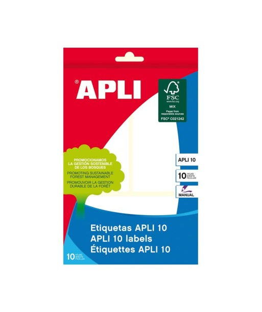 Etiquetas brancas com cantos arredondados, formato APLI 10, tamanho 53,0 x 100,0 mm, com adesivo permanente. ¶Embalagem com 10 folhas (30 etiquetas). ¶Rotulagem rápida e eficaz, sem necessidade de impressora. ¶Ideais para escrever com lápis, esferográfica (mesmo de tinta ou gel) ou marcador de secagem rápida. ¶Podem ser escritas à mão.¶¶Medidas: 53 x 100 mm¶Cor: Branco¶Cantos: Arredondados¶Adesivo: Permanente¶Certificação: FSC¶Folhas por embalagem: 10¶Formato de venda: Saco com eurofuro¶Formato: Retangular¶¶Usos específicos:¶Etiquetas para arquivamento¶Etiquetas comerciais¶Etiquetas domésticas¶Etiquetas manuscritas¶Etiquetas para organização¶Etiquetas de produto¶Etiquetas para destaque¶Etiquetas de sinalização