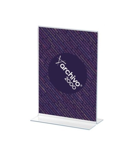 Expositor de mesa em forma de T Arquivo 2000 A5 vertical.¶¶Fabricado em poliestireno ultra-transparente de alta qualidade e resistência.¶Visibilidade dos dois lados.¶O documento pode ser inserido a partir de baixo ou de ambos os lados.¶Base larga que o torna muito estável.¶¶Medidas exteriores: 65x150x215 mm.