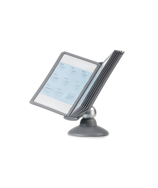 Sistema de painel de visualização fácil de rodar com 10 painéis SHERPA® em formato A4¶¶A esfera galvanizada permite uma rotação de 360° e a regulação do ângulo de leitura de 25° a 70°¶Painéis em polipropileno com moldura de perfil colorido e película de baixo reflexo adequada para scanners¶Inclui separadores com folhas de inserção em branco para etiquetar os painéis de exposição¶Mecanismo pivotante prático para uma substituição simples dos expositores¶¶Ideal para informação em escritórios ou ambientes representativos nos setores da hotelaria e da restauração¶¶Para Formato: A4¶Orientação: Retrato¶¶Largura interior do painel de visualização (mm): 210¶Altura do painel de visualização interior (mm): 297¶Largura exterior (mm): 530¶Altura exterior (mm): 490¶Profundidade/Comprimento exterior (mm): 380¶¶O conjunto inclui painéis de visualização: Sim¶Extensível: Não¶Abertura para documentos: Topo¶Separadores com etiquetas em branco incluídas: Sim¶Pode ser digitalizado: Sim¶Antirreflexo: Sim¶Tipo de base/suporte: Suporte de mesa¶5 anos de garantia