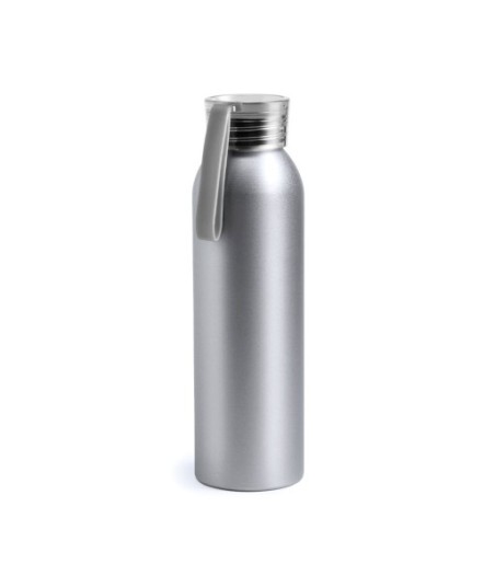 Garrafa Tukel¶¶Garrafa de alumínio com capacidade de 650 ml. ¶Corpo de cor prateada, com tampa de segurança aparafusada e em uma variedade de cores transparentes. ¶Alça de transporte de material TPR correspondente.¶