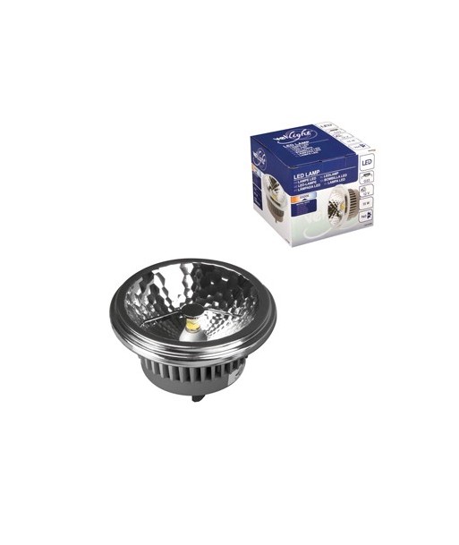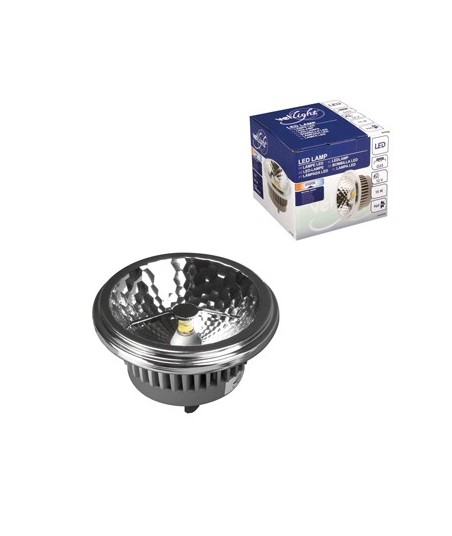 As lâmpadas AR111 COB LED são de alta qualidade, de energia eficiente, substituem idealmente as tradicionais lâmpadas de halogéneo de 75 W. ¶Ideal para uso em lojas de comércio em geral, hotéis, restaurantes, museus e outros edifícios comerciais, as lâmpadas LED AR111 fornecem distribuições de feixe claro e uniforme que são excelentes para iluminação local. ¶Podem reduzir o consumo de energia em mais de 80% quando comparados com lâmpadas halógenas.¶Combinados com um refletor, dão-lhe a mesma saída de luz que as lâmpadas de halogéneo.¶¶CARACTERÍSTICAS¶Reduzem o consumo de energia em mais de 80% em comparação com as lâmpadas tradicionais de halogéneo¶Ângulo de feixe de 24 graus fornece iluminação uniforme¶A temperatura de cor 5500 K é perfeita para a maioria das aplicações comerciais¶Com COB LED:¶Chip estereoscópico no corpo¶Uma tecnologia nova e exclusiva do pacote do diodo emissor de luz¶Desempenho melhorado em comparação com pacotes de LED existentes¶¶Tipo: AR111¶Socket: G53¶Tensão: 12 V AC / DC¶Consumo de energia: 15 W¶Equivalente potência da lâmpada incandescente: 75 W¶Vida útil média: 30 000 h¶Temperatura de cor: 5500 K¶Intensidade: 960 lm¶Cor: branco neutro¶Índice de renderização de cores: Ra> 80¶Dimmable: não¶Número de LEDs: 1¶Ângulo do feixe: 24 °¶Dimensões: Ø 111 x 66,5 mm¶Peso: 220 g¶¶Alimentador indicado: VELLPH-18-12  - Mean Well¶¶Tipo de embalagem: Caixa