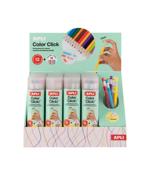 Expositor de Lapiseiras de Cor Color Click¶¶As lapiseiras Color Click foram concebidas para proporcionar uma experiência única de escrita e desenho. ¶Dá cor a todas as tuas ideias!¶¶Expositor com 12 caixas em formato tubo, cada uma com:¶¶12x lapiseiras com corpo em plástico¶12x recargas¶1x afia com depósito¶¶! Inclui ainda um tubo de experimentação com quatro lápis e um afia, ideal para que os clientes testem a qualidade do produto no momento.¶¶Medidas:  267 x 305 x 150 mm¶Cores sortidas: violeta, creme, preto, roxo, amarelo, vermelho, castanho, laranja, verde, verde escuro, azul e azul claro.¶Cada lapiseira contém uma mina de cor de 2,6 mm, um botão "click" para afiar a ponta e uma tampa com numeração da cor.¶¶Tudo o que precisas para desenhar, escrever e criar sem limites. ¶Além disso, o seu design protege a ponta, garantindo maior precisão e conforto.¶