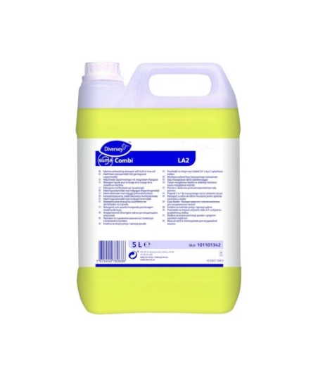 Suma Combi LA2 utiliza uma tecnologia inovadora para combinar, num único produto, um detergente líquido concentrado e um secante para lavagem automática de louça. Especialmente formulado para proporcionar uma remoção total da sujidade em águas de dureza até 9°fH, ou 90 ppm, e um excelente desempenho de secagem. ¶¶Propriedades ¶Suma Combi LA2 é um detergente líquido alcalino forte, com secante incorporado, adequado para utilização numa vasta gama de máquinas de lavar louça monotanque ou com abertura frontal (não adequado para máquinas de túnel). Contém uma mistura de alcalinos cáusticos e agentes de controlo do calcário que asseguram a remoção da sujidade. Devido ao inovador e único aditivo de secagem, que altera o comportamento da água, não existe necessidade de utilizar um secante em separado. ¶¶Benefícios ¶Tecnologia inovadora oferece, num só produto, detergente e secante ¶Garantia de uma secagem rápida ¶Elimina sujidade de gordura e comida ressequida ¶Fórmula altamente concentrada permite excelentes resultados de poupança ¶Previne a formação de calcário na máquina de lavar louça ¶Obtenção de resultados sem manchas ¶Sem cloro ¶Sem fosfatos ¶¶Instruções de utilização ¶Suma Combi LA2 é normalmente aplicado através de um sistema doseador automático da Diversey. Contudo, pode ser utilizado em conjugação com bombas doseadoras integradas, se instaladas. ¶De modo a assegurar resultados perfeitos de limpeza, dosear a uma concentração mínima recomendada de 0,4 ml/L*. ¶Uma concentração de 2 ml/L irá prevenir os depósitos de calcário em água contendo até 90 ppm CaCO3, 9 °fH. ¶Os níveis de dosagem poderão ser alterados de acordo com as condições de cada cliente (dureza da água, nível de sujidade, procedimentos). ¶Este produto não é adequado para sistemas onde seja utilizado um secante ácido como agente de prevenção de calcário.¶Na primeira utilização, enxaguar a bomba e os tubos de transporte do sistema doseador de modo a evitar possíveis cristalizações causadas pela mistura de produtos.