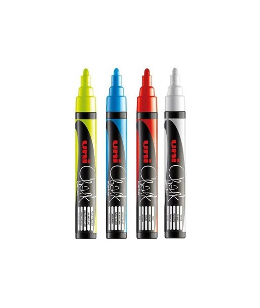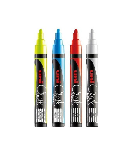 Os marcadores de giz Chalk Markers da Uni-Ball são um instrumento revolucionário para escrever em quadros negros. ¶Tal como um marcador, mas com uma ponta de giz, é possível escrever e apagar com toda a facilidade. ¶¶Os marcadores de giz escrevem em várias superfícies: quadros de ardósia, janelas, metais, plástico e outras superfícies não-porosas.¶Resistentes à água¶Corpo em Plástico¶Ponta poliester em forma de bala¶Largura da linha 1.8-2.5mm media¶Resistente à chuva, neve e outras condições meteorológicas¶Tinta opaca e cores vivas¶Facilmente removivel de superficies não porosas usando um pano húmido e fricção¶Usado em: Quadros de Ardósia, Janelas, Plástico e Vidro
