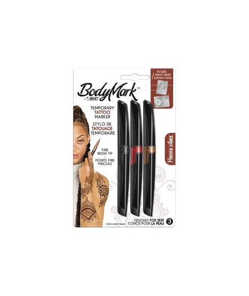 EXPRESSA-TE NA TUA PELE com os marcadores de tatuagem temporária BodyMark da BIC.¶Perfeitas para festivais, eventos desportivos e festas!¶¶Liberta a tua imaginação! Apetece-te desenhar ou escrever algo na pele? Ou preferes experimentar uma tatuagem antes de a tornar permanente? ¶E se experimentasses uma tatuagem só por uma noite, durante um fim de semana com amigos, numa festa ou festival? ¶Os marcadores BodyMark são produtos aptos para utilizar na pele e concebidos especialmente para desenhares tatuagens temporárias. ¶Podes escolher entre oito tons de cores vivas: preto, castanho, vermelho, rosa, roxo, azul, azul-claro e verde. ¶Para além disso, contêm tinta quase inodora que pode durar dias.¶Possuem uma ponta fina e flexível que se ajusta à pressão, para que possas desenhar linhas mais finas ou colorir espaços maiores. ¶¶Cores: Preto,  Castanho Henna, Vermelho Henna.¶Ponta traça linhas entre 1.00 e 4.00mm de espessura.¶Oferta de moldes com desenhos para tatuar que podem durar alguns dias.¶Secagem ultra rápida sem manchar.¶¶Dicas: ¶Lava e seca a pele antes de aplicar o produto.¶Para criares a tatuagem, pressiona suavemente para obteres linhas finas e faz um pouco mais de pressão para obteres um traço mais grosso.¶Precisas de inspiração? entra aqui: https://pt.bicworld.com/bodymark-by-bic¶Se tiveres cuidado com a tatuagem, pode durar alguns dias.¶¶Como retirar a tatuagem:¶Queres mudar de tatuagem? Lava-a bem com água e sabão.¶Pode ser necessário lavá-la algumas vezes. Não te preocupes se não sair à primeira vez: a tatuagem não é permanente!¶¶Marcador de tatuagens temporárias seguro para a pele: cumpre com o regulamento de cosméticos. ¶Deve seguir todos os avisos e instruções. Não testado em peles sensíveis.¶