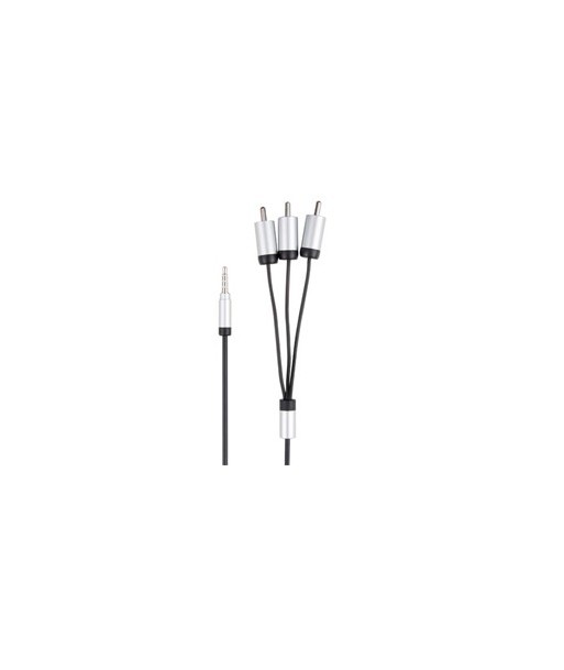 Cabo A/V, 3.5 mm macho vs 3RCA macho, revestimento em TPE, fichas metálicas, cor preta¶¶Conectores:¶Macho 3.5 mm¶RCA macho x 3 (áudio: vermelho + branco + vídeo: amarelo)¶¶Conector/caixa: prateado / liga de prata e alumínio¶Isolamento: TPE preto¶Comprimento: 1 m¶Conectores: dourados¶Tipo de cabo: cabo OFC¶Interior: 10 x 0,1 mm¶Revestimento: 28 x 0,1 mm¶