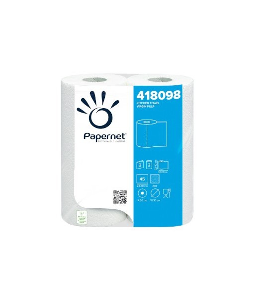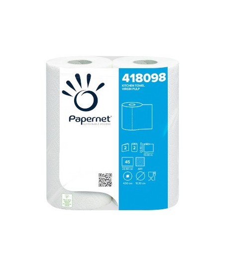 As toalhas de mão Papernet são perfeitas para os estabelecimentos que necessitam de uma ferramenta consistente, eficaz e prática para uma limpeza completa.¶¶Qualidade: Branco, Celulose Pura¶Nº Folhas: 2¶Folhas por Rolo: 45¶Gramagem: 20,5 g/m²¶¶Altura da Folha: 22,4 cm¶Comprimento da Folha: 22,6 cm¶Diâmetro do Rolo: 10,3 cm¶Comprimento do Rolo: 10,17 m¶Mandril: 3,8 cm¶¶Dimensões da caixa: 22,5 x 82,4 x 61,8 cm¶Volume: 0,115m3¶¶Certificações¶EU ECOLABEL¶O rótulo ecológico da UE indica um produto que garante um impacto ambiental reduzido em todas as fases do seu ciclo de vida.