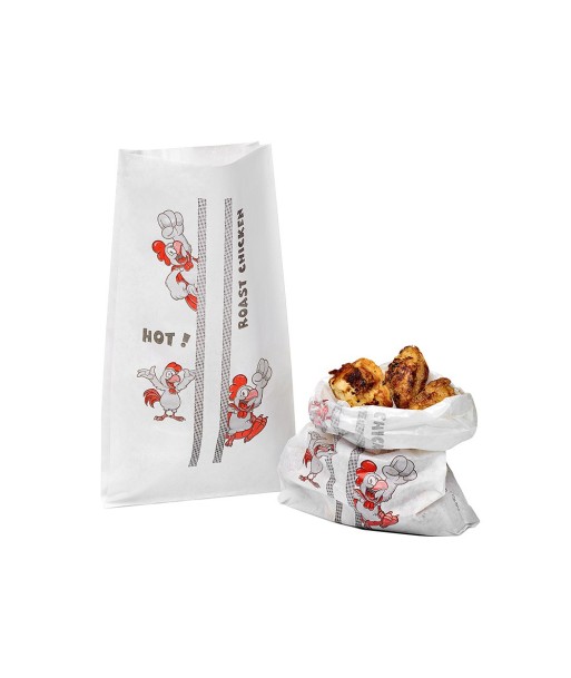 Os sacos para frango assado são feitos em papel anti gordura, ideais para estabelecimentos que funcionam em regime de Take Away.¶¶Resistente a óleos e gordura¶Material: Papel de celulose branco + PP (polipropileno) ¶Medidas: 20 + 5 x 34 cm¶