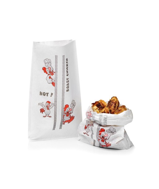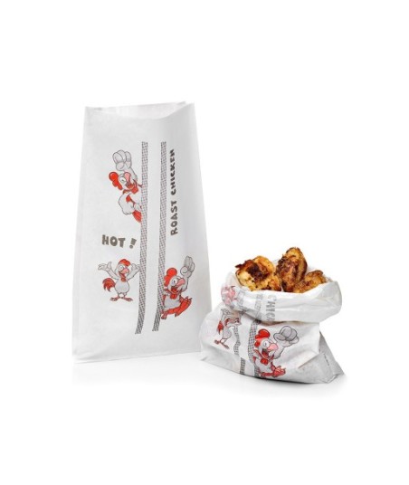 Os sacos para frango assado são feitos em papel anti gordura, ideais para estabelecimentos que funcionam em regime de Take Away.¶¶Resistente a óleos e gordura¶Material: Papel de celulose branco + PP (polipropileno) ¶Medidas: 20 + 8 x 42 cm¶