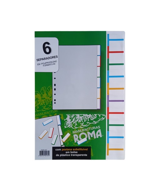 Com pestana substituível em bolsa de plástico transparente.¶¶Em polipropileno resistente.¶6 Separadores¶Formato A4¶