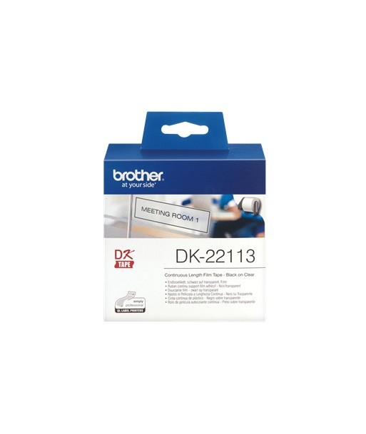 Rolo de fita contínua para etiquetas autocolantes de tamanho personalizado. Fita contínua de película plástica (transparente). Largura: 62 mm. Comprimento: 15,24 m¶¶A Fita contínua DK22113 (texto preto sobre fundo transparente) permite criar etiquetas com tamanhos personalizados. O material é película plástica, mais fina e leve que o autocolante convencional. O material plástico da superfície dá maior resistência que as etiquetas de papel e um toque mais suave. Desenhada para uma identificação temporária, o adesivo foi desenvolvido para evitar que a etiqueta se descole antes do pretendido. O fundo transparente permite identificar objetos e sinalizar alterando o menos possível o elemento sobre o qual se colam as etiquetas. Se o comprimento da informação a incluir na etiqueta varia, as fitas contínuas são a melhor opção. Pode incorporar de forma rápida e simples: imagens, logotipos, códigos de barras, datas ou qualquer outra informação.¶¶Dispositivos Relacionados:¶¶Brother QL-500¶Brother QL-500A¶Brother QL-500BS¶Brother QL-500BW¶Brother QL-500 Series¶Brother QL-550¶Brother QL-560¶Brother QL-560 Series¶Brother QL-560VP¶Brother QL-560YX¶Brother QL-570¶Brother QL-580¶Brother QL-580N¶Brother QL-580 Series¶Brother QL-600¶Brother QL-600B¶Brother QL-600G¶Brother QL-600R¶Brother QL-650TD¶Brother QL-700¶Brother QL-710 Series¶Brother QL-710W¶Brother QL-710WSP¶Brother QL-720NW¶Brother QL-800¶Brother QL-810W¶Brother QL-820NW¶Brother QL-820NWB¶Brother QL-820 Series¶Brother QL-1050¶Brother QL-1050N¶Brother QL-1060N¶Brother QL-1060NX¶Brother QL-1100¶Brother QL-1100NWB¶Brother QL-1100 Series¶Brother QL-1110¶Brother QL-1110NWB¶¶¶