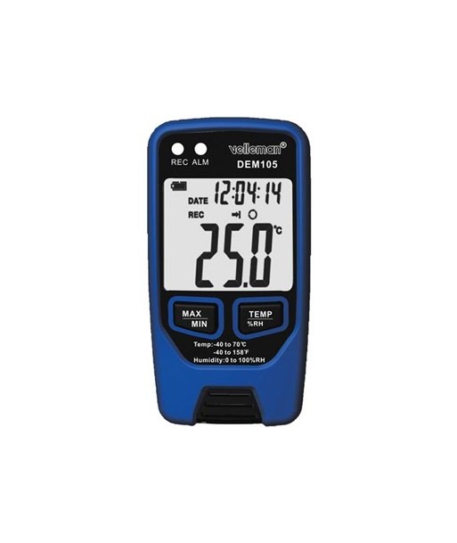 Capacidade de memória para 32700 leituras¶LCD para exibir a informação registada com facilidade¶Ciclo de medição selecionável de 1 seg até 24 horas¶Exibe os estados do Alarme e Gravação com 2 LEDs¶¶O alarme emitirá um apito alto durante 10 milésimos de segundo se exceder o valor definido para o alarme alto/baixo¶Software de análise utilizado para visualizar graficamente ou em modo de texto os dados registados¶Interface USB para computador (programa de software avançado para todos os windows)¶¶Inclui: capa de proteção, clip de montagem, cabo USB, software em inglês para Windows® XP, Vista, 7, 8.1 (32 e 64 bit), manual, pilha¶Pilha de longa duração: mais de 2 anos (sob as condições ideais de 22 °C)¶¶Humidade relativa:¶Amplitude total: 0 - 100 % RH¶precisão (0 % - 30 % e 70 % - 100 %): ± 5.0 % RH¶precisão (30 % - 70 % ): ± 3.0 RH¶¶Temperatura:¶Amplitude total: de -40 °C a 70 °C (de -40 °F a 158 °F)¶Precisão: (0 °C a 70 °C / 32 °F a 158 °F) ± 1 °C¶Precisão: (-40 °C a 0 °C/ -40 °F a 32 °F) ± 1.5 °C¶¶Velocidade de registo: intervalo de amostragem selecionável: de 1 segundo a 24 horas, temperatura de funcionamento de -35 °C a 80 °C (-31 °F a 176 °F)¶¶Alimentação: 1 x lítio 3.6 V / 1200 mAh SAFT 1/2AA LS14250 (incl.)¶Duração da bateria: ± 2 anos¶Dimensões: 96 x 50 x 30 mm¶Peso com pilha: 82 g¶Tipo de embalagem:	Box (Carton)