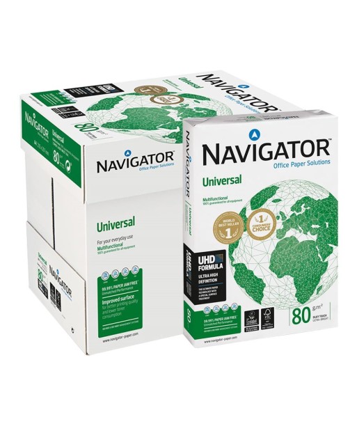 PAPEL UNIVERSAL 80 g.m -2 / Desempenho de confiança que nunca falha.¶¶AUMENTO DA PRODUTIVIDADE¶Papel 99.99% livre de encravamentos. Menos encravamentos significa um custo mais baixo por documento impresso.¶¶TRATAMENTO ESPECIAL DE SUPERFÍCIE¶Fornece uma excelente qualidade de impressão em impressão inkjet devido à absorção de tinta inteligente.¶¶MULTIFUNCIONAL¶Garantido a 100% para todas as impressoras e fotocopiadoras. O papel Navigator pode ser usado para todos os seus documentos.¶¶SUAVIDADE AO TOQUE¶Superfície extra suave. ¶O papel Navigator é em média 1/3 mais suave do que a maioria dos papéis de escritório. Esta superfície mais suave significa um menor consumo de tinta e abrasividade reduzida, resultando em menos danos às impressoras e numa vida útil mais longa do equipamento de escritório.¶¶FÓRMULA UHD¶A fórmula UHD é um tratamento de superfície especial que mantém o pigmento da cor perto da superfície, garantindo uma definição vívida, de alto contraste e secagem rápida.¶Impressões de alta-definição em inkjet terão uma aparência mais realista.¶¶Certificação: FSC¶Tamanho: A4 (210 x 297 mm)¶Cor: Branco¶Cada embalagem contém 500 folhas de papel de 80 g/m²¶5 resmas/caixa¶¶Rótulo Ecológico EU: Sim¶Reciclado: Não¶Totalmente livre de cloro: Sim¶¶Gramagem do papel: 80 g/m²¶Brancura do papel (CIE): 169¶Perfurado: Não¶Largura: 213 mm¶Opacidade: 0.95