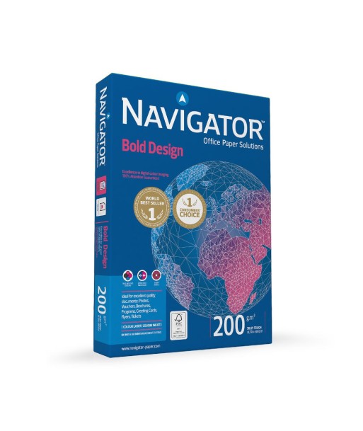 BOLD DESIGN 200 g.m -2 / Excelente definição que dá vida às imagens.¶Ideal para fotos e brochuras.¶¶EXCELÊNCIA NA IMPRESSÃO DIGITAL A CORES¶Perfeito para aprimorar a qualidade da imagem com alto contraste e definição.¶¶DOCUMENTOS COLORIDOS IMPRESSIONANTES¶Garantia de 100% de atenção, exibindo cores reais e imagens vivas.¶¶Uso garantido em todos os equipamentos de escritório, para aplicações de alta qualidade e especialidade.¶¶Com uma superfície melhorada e espessura superior, o papel Navigator Bold Design é ideal para documentos de elevada qualidade como fotos, vouchers, brochuras, programas, cartões de visita, flyers e bilhetes. ¶¶Papel Navigator Bold Design para impressoras laser e jato de tinta¶Espessura extra e peso de 200 g/m²¶Tamanho: A4 (210 x 297 mm)¶Cor: Branco¶Opacidade 98%¶