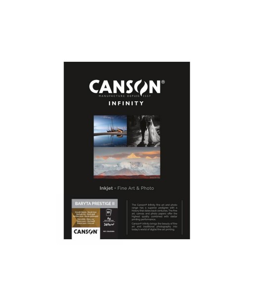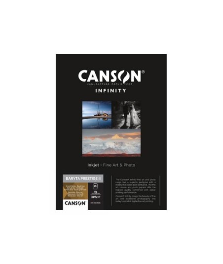 O papel Canson Infinity Baryta Prestige II 340g possui o aspeto de um papel tradicional de sala escura que é conseguido pela adição prévia de Sulfato de Bário à camada de receção de jato de tinta. ¶Com um tom branco natural, conseguido sem o uso de quaisquer agentes branqueadores ópticos (OBAs). ¶¶O aspeto brilhante do Baryta Prestige II acentua os pretos profundos e os brancos puros assim como intensifica a gama de cores. ¶O papel oferece uma qualidade de imagem, detalhe e gama tonal excepcionais para produzir imagens a cores e a preto e branco excelentes. ¶¶Fabricado com uma mistura de alfa celulose e algodão, o papel possui excelentes qualidades e possui as certificações FSC® e ISO9706.¶¶Cor: Branco¶Gramagem: 340 g/m²¶Superfície: Extra-suave¶Acabamento: Brilhante¶Formato: Folhas