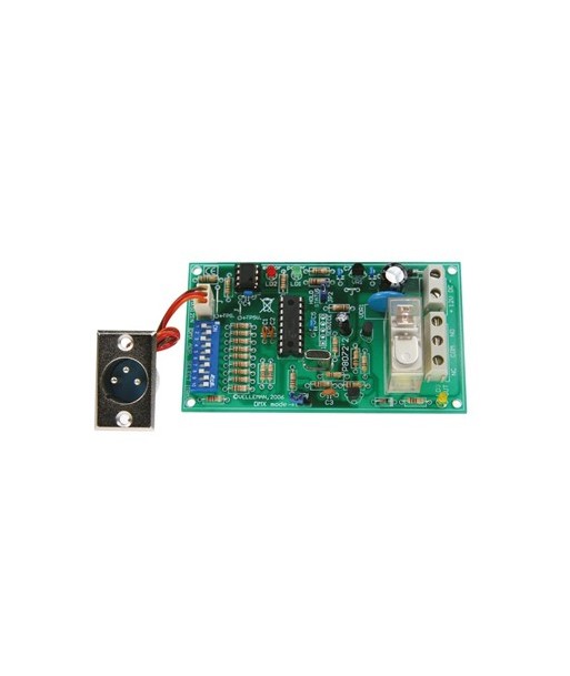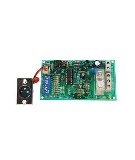 Este módulo permite o controlo de um relé por meio do protocolo bem conhecido DMX512.¶Este é usado para controlar dimmers, scanners, moving heads e outros dispositivos de iluminação com uma fiação simples.¶Em alguns casos, uma simples seleção ON / OFF é desejada. É aí que este módulo vem de encontro às espectativas.¶É realmente um Bus Control Power. ¶O relé é ativado quando o valor DMX do canal atribuido equivale a 140 ou mais e desliga quando o valor é de 120 ou menos.¶¶Juntamente com os nossos K8062/VM116, uma automação controlada por computador vai ser muito fácil de construir.¶¶Sistema de endereços: 512 endereços exclusivos, DIP switch configurável¶Indicação LED para fonte de alimentação, o estado de saída de relé e situação de erro¶"Safe DMX fluxo de dados" modo reduzindo a interferência a um mínimo¶"Relay hold" função em caso de perda de sinal DMX¶Controle: DMX-512, 3-pin XLR plug (incl.)¶¶Capacidade de comutação: 10A (carga resistiva)¶Tensão de alimentação: 12VDC não regulamentados¶Consumo de energia: max. 100mA¶Dimensões: 105 x 60 x 30mm / 4.1 x 2.4 x 1.2 "