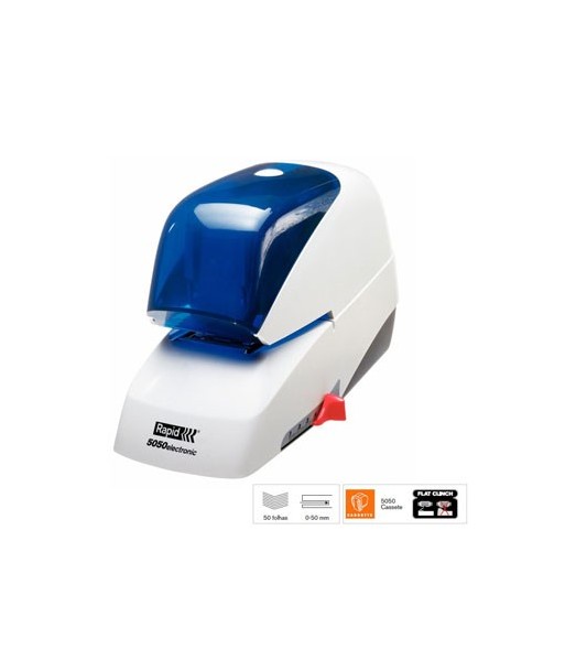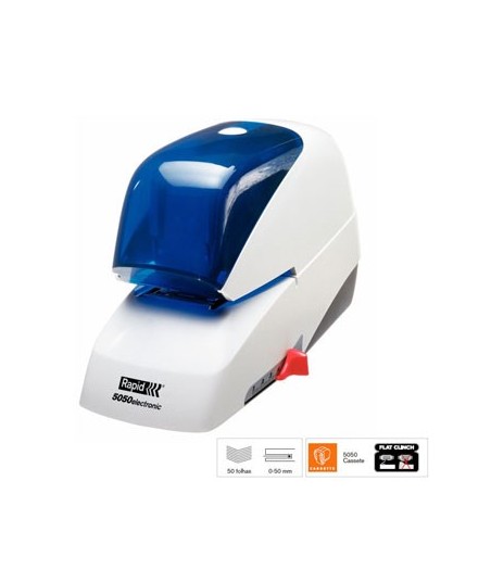 Capacidade de agrafamento de: 50 folhas¶Elétrica: Sim¶Tipo de Agrafos: 5050 Cassette¶Mecanismo de carregamento: Cassete¶Volume de fornecimento: Uma cassete incluída (5.000 agrafos)¶Agrafamento clinch Plano¶Inclusão Profundidade: 50 mm¶¶Cor: Branco / Azul¶Dimensões (mm): 176 x 209 x 417¶