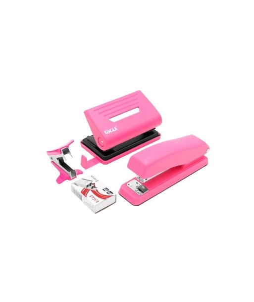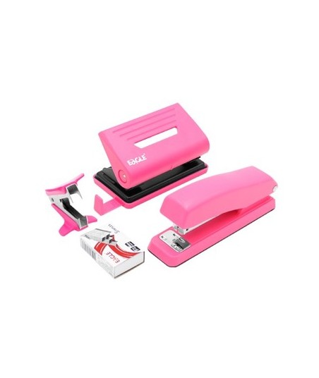 Conjunto Agrafador+ Furador + Saca Agrafos Eagle Rosa Néon