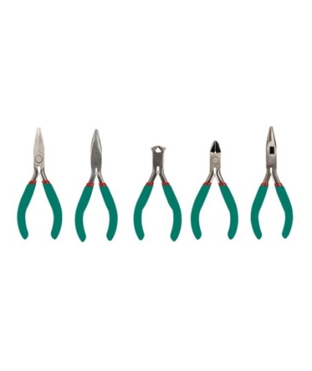 Este conjunto de 5 alicates de precisão é a melhor adição ao seu arsenal de ferramentas. ¶Inclui tudo o que é necessário para várias tarefas de precisão, quer se trate de cortar, dobrar ou agarrar materiais.¶¶Cada conjunto inclui cinco alicates de precisão essenciais, incluindo um cortador lateral, um cortador de extremidades, um alicate de bico redondo, um alicate de bico plano e um alicate de bico longo. ¶¶Materiais de alta qualidade: Os alicates são fabricados em aço cromo-vanádio (CrV) durável, garantindo uma utilização duradoura e resistência ao desgaste.¶¶Design ergonómico: Cada ferramenta foi concebida tendo em conta o conforto e a facilidade de utilização, permitindo-lhe trabalhar sem esforço e com precisão.¶¶Isolamento: Para maior segurança, estes alicates são isolados, o que os torna adequados para trabalhos eléctricos sem risco de choques elétricos.¶¶Multifuncional: Quer esteja a trabalhar em eletrónica, construção de modelos, joalharia ou outros projectos de precisão, estes alicates proporcionam a versatilidade e a precisão de que necessita.¶¶Alicate de bico longo: 125 mm (5")¶Alicate de bico torto: 125 mm (5")¶Alicate de bico chato: 125 mm (5")¶Cortador diagonal: 110 mm (4,5")¶Cortador superior: 110 mm (4,5") ¶¶
