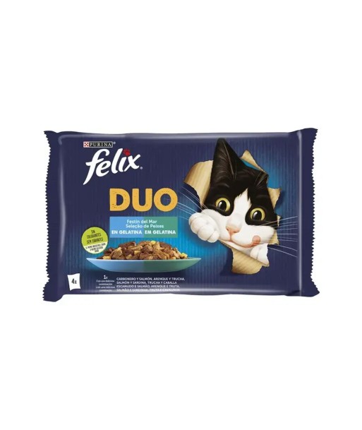 PURINA FELIX Fantastic Duo Seleção de Peixes¶Formatos disponíveis: 4x85g¶¶Cuidadosamente cozinhado para garantir que o seu traquinas desfruta de um prato delicioso em cada refeição.¶Sabores de fazer crescer água na boca que certamente irão satisfazer o apetite do seu gato.¶Disponível em saquetas individuais para oferecer uma refeição em minutos que o seu gato vai adorar.¶100% das necessidades diárias do seu gato.¶Com vários sabores disponíveis, vai ser difícil escolher o preferido!¶Sem corantes, o mesmo delicioso sabor.¶¶FELIX Fantastic Duo é uma gama de irresistíveis refeições, com um aspeto, aroma e sabor tão delicioso que poderiam ter sido preparadas por si! ¶Cada receita, feita com ingredientes de qualidade, tem tenros pedaços que combinam dois deliciosos sabores numa gelatina para que o seu gato possa desfrutar dois dos seus sabores favoritos apenas numa deliciosa refeição! ¶¶FELIX Duo está disponível numa variada gama de deliciosas receitas numa suculenta gelatina para satisfazer a variedade que o seu gato adora diariamente. ¶São mesmo duplamente saborosas! ¶¶FELIX - Apenas Irresistível!¶