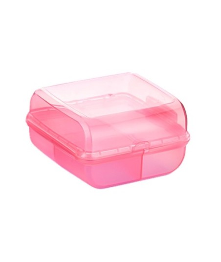 Caixa com diferentes compartimentos ideal para transportar alimentos do tipo sanduíche e suplementos alimentares. ¶¶Produtos adequado para contacto com alimentos.¶Plástico sem BPA, não lavar na máquina de lavar louça. ¶¶Dimensões: 14,5 x 14,5 x 8 cm¶Cor: Rosa