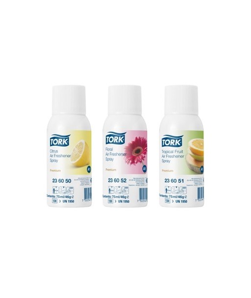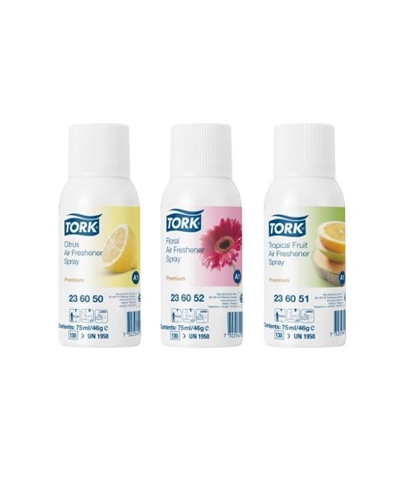 Controle os odores na sua casa de banho de forma eficaz e eficiente com o Tork Ambientador em Aerossol - Embalagem Combinada. ¶Os ambientadores em aerossol contêm óleos perfumados concentrados e agentes neutralizadores que permitem eliminar odores desagradáveis e proporcionam uma sensação de frescura duradoura. ¶Os aerossóis são indicados para a utilização com o Tork Dispensador para Ambientador em Aerossol.¶¶Instalação flexível, adequada a diferentes estilos de casas de banho¶Fragrância adequada para os seus hóspedes e desenvolvida pelos principais criadores de perfumes europeus¶Um aroma fresco para uma sensação de limpeza¶¶Fragâncias: Frutas, Limão, Floral (4un de cada)¶Sistema: A1 - Sistema de ambientador¶Qualidade. Premium¶Cor: Transparente¶¶Dispensador Compatível:¶Ref: 686562000 - Dispensador Ambientador TORK A1 ¶ ¶