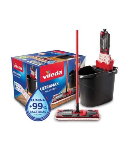 O sistema Vileda Ultramax é um conjunto completo para limpar o chão a molhado. ¶Ao contrário de outros sistemas genéricos de limpeza, o UltraMax permite uma limpeza profunda e rápida em todas as suas divisões. ¶Não precisa de estar sempre a mudar de utensílios para diferentes superfícies. ¶Graças ao seu formato plano poderá limpar uma maior área de cada vez, reduzindo o tempo que despende nesta tarefa.¶¶Com capacidade para recolher 30% mais partículas do que na versão anterior da UltraMax, este conjunto de mopa e balde com espremedor é ideal para limpar todos os pavimentos, principalmente para limpar chão de madeira e laminados. ¶Mesmo partículas maiores como os cabelos são apanhados facilmente. ¶Com apenas uma passagem, o seu chão vai cintilar, limpo e brilhante como novo.¶¶Graças à mopa 2 em 1 com microfibras Vileda, obtém-se uma performance de limpeza sem mácula, pois as fibras especiais vermelhas e cinzentas removem a sujidade. ¶Nem mesmo a gordura ou restos de comida resistem a este inovador design em microfibra.¶¶A prática cabeça articulada basculante a 180° facilita a limpeza em redor e debaixo dos seus móveis, assegurando flexibilidade e eficácia.¶¶BENEFÍCIOS DA MOPA E BALDE ULTRAMAX¶¶Fácil de espremer: Para introduzir a mopa no balde ou para a espremer, pressione com o pé a peça vermelha junto ao cabo. Este movimento permite que a mopa se adapte automaticamente à posição adequada. Quanto mais seca desejar que a mopa fique mais vezes deverá pressionar dentro do espremedor.¶¶Têxtil Lavável na Máquina: Separe a recarga da mopa do seu suporte plástico e simplesmente coloque-a na máquina a um máximo de 60°C para a limpar. Isto poupa-lhe dinheiro, evita desperdício e protege o ambiente.¶¶"Powerzone" para menos esforço: Descubra o poder PowerZone, um padrão texturado na parte central da estrutura plástica, que possui uma dupla funcionalidade.