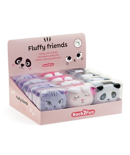 Expositor - 305 x 230 x 260 mm¶12un - 4 de cada modelo¶Gato, Coelho, Panda¶¶Mini carteiras para organizar moedas ou objetos pequenos.¶Fecho de correr.¶Com porta-chaves¶¶Material: poliéster com efeito felpudo e pormenores bordados.¶Porta Moedas - 95x95x60mm