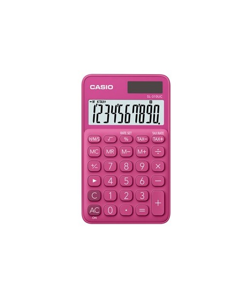 Calculadora de Bolso Casio SL310UCRD¶¶Características do produto:¶Cálculo de tempo¶Cálculo de impostos¶¶Tipo de produto: Tipo portátil¶¶Número de dígitos: 10 dígitos¶¶Visor de cristais líquidos:¶Ecrã extra grande¶Sinais de comando de função¶Separadores de milhares de 3 dígitos¶¶Características principais: Teclas de plástico¶¶Funções das teclas:¶Teclado com memória¶Tecla Shift¶Mudança de sinal (+/-)¶¶Memória: Memória independente¶¶Fonte de alimentação: Energia solar e pilha¶¶Tamanho (P × L × A): 118 × 70 × 8.4 mm¶Peso: 50 g¶Cor: Vermelho