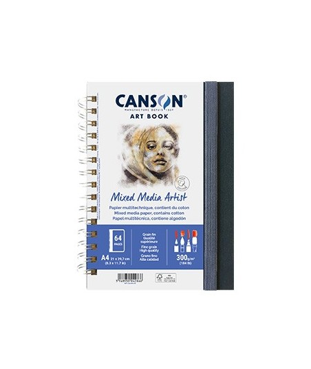 O papel Canson® Mixed Media Artist é o autêntico papel para a técnica mista do mercado. A sua superfície é ideal para todas as técnicas e é resistente tanto para aguarela como com tinta acrílica, mas também funciona com tintas e marcadores. A o seu excepcional conteúdo de algodão proporciona-lhe estabilidade.¶¶Este papel profissional destaca-se pela sua textura fina que retém facilmente os pigmentos e asua cor branco natural atribui calor às criações.¶¶Canson® Mixed Media Artist também está disponível no formato caderno. Com capa dura e o um elegante fecho elástico, é o companheiro ideal para potenciar a criatividade quando viaja. A sua bolsa interior é ideal para guardar as memórias mais preciosas. ¶¶Branco Natural¶Grão fino ¶Espiralado lado longo (retrato)¶¶A4 - 21 x 29,7 cm¶300gr¶56 folhas ¶Certificação FSC¶Livre de ácido¶Não tem quaisquer aditivos ótico branqueadores¶Está em conformidade com a norma ISO 9706