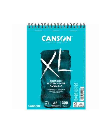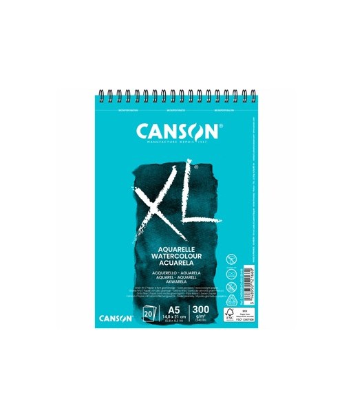 Bloco Espiralado Canson XL® Aquarelle¶¶XL® Aquarelle é um papel especialmente desenvolvido para técnicas húmidas incluíndo a aguarela. Perfeito para estudantes, é muito fácil de corrigir com uma esponja ou um pincel.¶¶Ideal para um ampla variedade de técnicas húmidas. ¶Apresenta grão fino e é livre de ácidos. ¶A sua fórmula assegura uma excelente capacidade de remoção do excesso de água.¶Argolas em espiral do lado mais curto.¶¶Bloco A5 de grão fino¶14,8x21 cm¶300gr¶20 Folhas¶¶Não tem quaisquer aditivos óptico branqueadores¶Possui tratamento anti-fungos¶Está em conformidade com a norma ISO 9706¶Certificação FSC