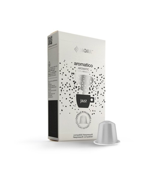 CÁPSULAS MOAK AROMATIC JAZZ COMPATÍVEIS NESPRESSO ¶¶Já ouviu um café? Cinco blends, todos diferentes, cada um combinado com um género musical, com personalidade forte, delicada ou perfumada. ¶Porque o café, tal como a música, para ser um verdadeiro prazer, deve corresponder às notas da alma.¶Escolha o que mais se aproxima do seu gosto!¶¶Excelentes matérias-primas e processo de produção controlado.¶Sentimos fortemente a responsabilidade de reduzir o impacto ambiental.¶Assumimos um compromisso com a natureza.¶Desde o cuidado com que selecionamos os melhores cafés cultivados respeitando o trabalho do homem e do meio ambiente, até o uso de energia 100% de fontes renováveis em todas as nossas atividades.¶¶EU SOU JAZZ!¶O sabor aromático do precioso blend 100% Arábica, expressa-se nas envolventes notas florais e frutadas e na delicada cremosidade. ¶Aromático é um café harmonioso, de caráter doce e vibrante. ¶Intensidade 3¶Material cápsulas: Alumínio¶As cápsulas são compatíveis com as máquinas Nespresso®¶*Nespresso® não é uma marca registrada de propriedade do Caffè Moak Spa ou de empresas a ele ligadas e/ou controladas por ele e é usada aqui apenas para fins descritivos.¶¶Origem¶Brasil, Honduras, Costa Rica, Ethiopia, Peru¶¶Compatibilidade¶Citiz, Essenza, Lattissima, Maestria, Pixie, U