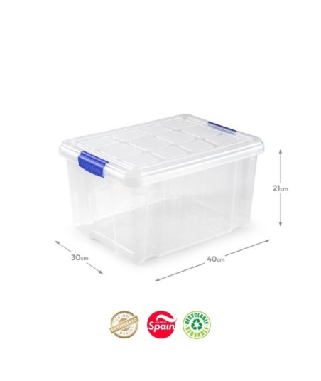 Caixa de armazenamento de plástico com capacidade para 16 litros. ¶¶Indicado para arrumação e arrumação na casa, jardim e garagem. Caixa especialmente indicada para a encomenda de armários (roupas, cobertores, brinquedos).¶¶Contém tampa com dois fechos.¶¶Medidas Exteriores: 40 x 30 x 21 cm¶¶Reutilizável¶Reciclável¶