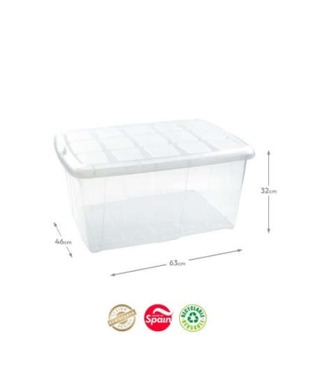 Caixa de armazenamento de plástico com capacidade para 60 litros. ¶¶Indicado para arrumação e arrumação na casa, jardim e garagem. ¶Caixa especialmente indicada para a encomenda de armários (roupas, cobertores, brinquedos).¶¶Contém tampa com dois fechos.¶¶Medidas Exteriores: 46 x 63 x 32 cm¶¶Reutilizável¶Reciclável