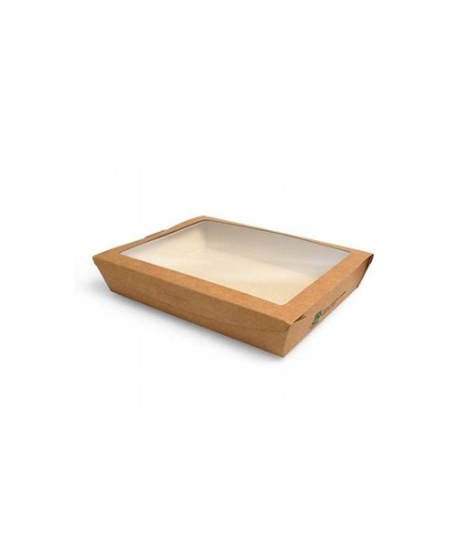 Caixa ecológica com janela da inovadora e sustentável "100% Fair".¶¶Com tampa prática articulada¶Material: Cartão de fibra fresca certificado FSC® não branqueado com revestimento orgânico e janela de visualização feita de PLA¶Cor: Kraft¶Feito de matérias-primas renováveis, completamente biodegradável¶Adequado para alimentos gordurosos¶Não adequado para alimentos líquidos¶¶Para pessoas com consciência ambiental - Vendas domésticas, grandes consumidores e fornecedores ¶Ideal para embalar e transportar saladas frescas e vários lanches de todos os tipos¶¶Capacidade: 1500 ml¶Dimensões: 18 x 22,5 cm (fundo 16 x 21 cm)¶Altura: 4,5 cm¶¶Certificado FSC®.