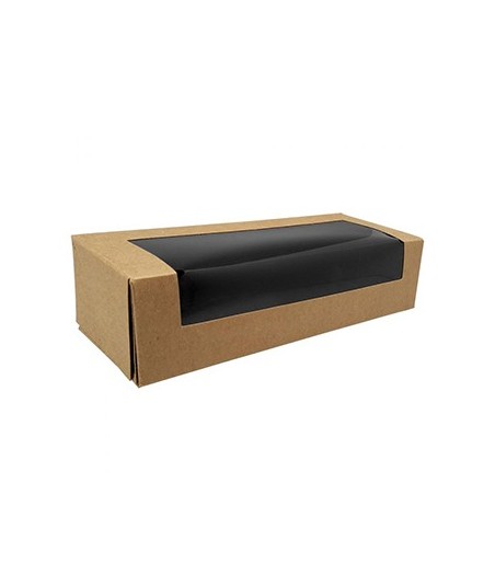 Estes recipientes oferecem uma apresentação elegante e espetacular para o sushi.¶¶Exterior em kraft com janela e interior em preto. ¶¶Adequado para contato alimentar ¶Não apto para micro-ondas ou forno ¶Não apto para congelação ¶Reciclável ¶¶Medidas: 19,5 x 7 x 4,5 cm