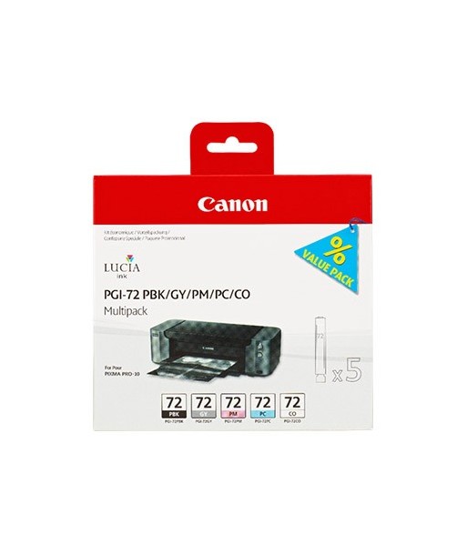 Pack Tinteiro Canon 72 5 Cores 6403B007 ¶14ml ¶¶Preto Foto¶Azul Foto¶Magenta Foto¶Cinzento¶Otimizador Cromático¶¶Impressoras Compatíveis:¶¶Canon Pixma Pro 10¶Canon Pixma Pro 10 S