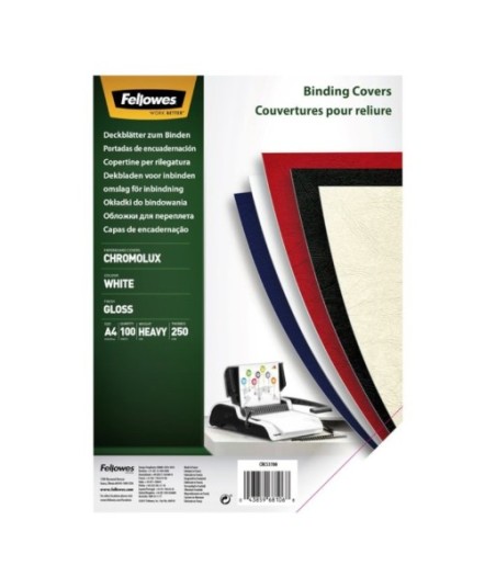 Descubra a solução perfeita para dar aos seus documentos encadernados um acabamento profissional e atraente.¶A capa de encadernação FELLOWES foi concebida para quem valoriza a estética e a durabilidade nos seus projetos.¶Com um design brilhante e robusto, estas capas não só protegem como também melhoram a apresentação dos seus documentos.¶¶Tamanho : Ideal para documentos DIN A4, o padrão comum em papelaria de escritório.¶Material e Acabamento : Fabricado em cartão Chromolux com um acabamento elegante e brilhante.¶Gramagem : 250 g/m², oferecendo uma grande rigidez para proteger os seus documentos.¶Versatilidade : Compatível com os métodos de encadernação em espiral, pente e térmica.¶Embalagem : Embalagem de 100 unidades, ideal para grandes volumes de trabalho.¶Aplicações : Perfeito para escritórios, instituições de ensino e uso profissional.¶¶CARACTERÍSTICAS¶Tipo: Capas¶Material: Cartão¶Formato: Din a4 (210 x 297 mm)¶Cor: Branco¶Espessura: 250 g¶