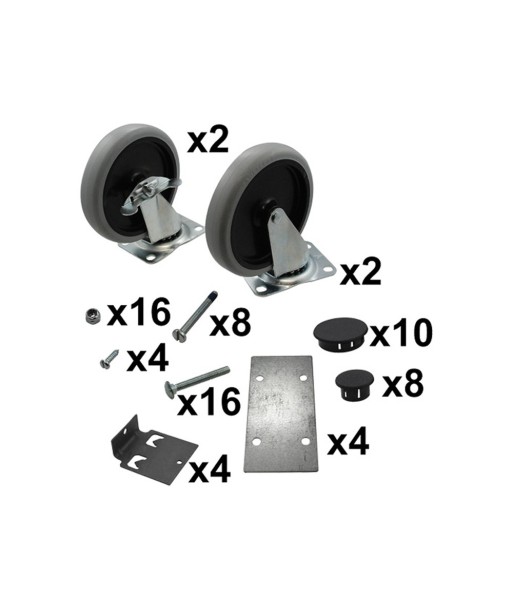 O kit inclui (2) rodízios de placa giratória de 5", (2) rodízios de placa rígida de 5" e ferragens.