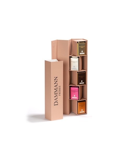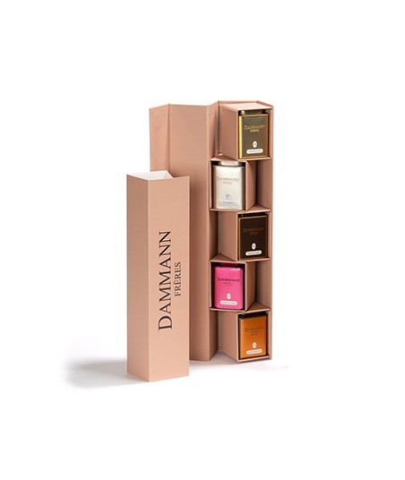 Quando aberta, esta caixa revela uma gama de 3 chás aromatizados e 2 misturas aromatizadas em latas de metal de 30 g.¶¶GRANDE SABOR RUSSO, chá preto aromatizado - 30g¶Chá preto, aroma de caviar de limão e óleo essencial de bergamota, casca de bergamota, pétalas de flores.¶¶MISS DAMMANN, chá verde aromatizado - 30g¶Chá verde, pedaços de gengibre, óleo essencial de limão e aroma de maracujá, pétalas de flores.¶¶FIM DE SEMANA EM PARIS, chá oolong aromatizado - 30g¶chá Oolong, aromas (flores de cereja e pêssego, amêndoa) e óleo essencial de rosa, pétalas de flores.¶¶BOLO DE CENOURA ROOIBOS, rooibos aromatizado - 30g rooibos¶sul-africano, canela, gengibre, cenoura, sabor amêndoa, noz pecã, biscoito.¶¶CARCADET DE FRAMBOESA, preparação aromatizada para infusão - 30g¶Flores de hibisco, cascas de roseira brava, pedaços de maçã, pedaços de framboesa, pétalas de flores, aromas (framboesa, maracujá).¶¶Peso líquido: 150 g