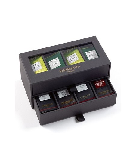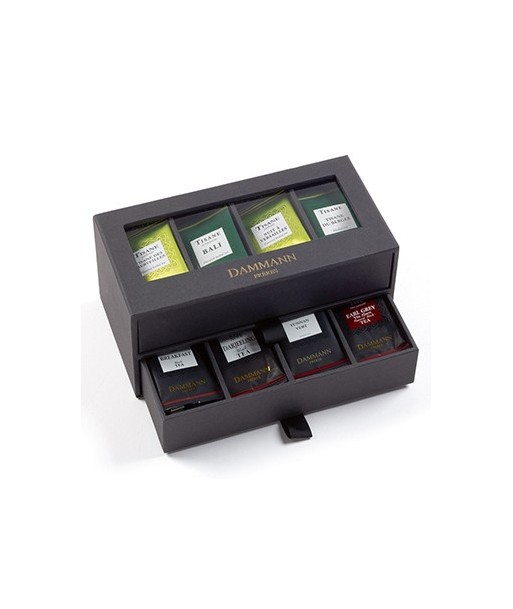 CAIXA "24H / 24", CAIXA PRETA COM 2 GAVETAS¶¶Caixa de 56 sachês de Cristal® envelopados (7 sachês de 8 variedades de chás aromatizados e chás de ervas): ¶Tisane des Merveilles, Tisane Bali, Tisane Nuit à Versailles, Tisane du Berger, Breakfast, Darjeeling, Yunnan Vert, Earl Gray Yin Zhen.¶¶Peso líquido: 110,6 g ¶L / h / d: 23,7 / 11,5 / 12 cm¶¶TISANE DES MERVEILLES, chá de ervas aromatizado - 7 saquetas¶Verbena, flor de tília, pétalas de flores, aromas (ruibarbo, framboesa, Gariguette morango, tâmara, flor de laranjeira) e óleo essencial de rosa.¶¶TISANE BALI, chá de ervas aromatizado - 7 saquetas¶Tília, verbena, aromas (lichia, toranja, pêssego e rosa), pétalas de flores.¶¶TISANE NUIT À VERSAILLES, chá de ervas aromatizado - 7 saquetas¶Casca de Rosa Mosqueta, verbena, flor de tília, pétalas de flores, aromas (bergamota, kiwi, flor de laranjeira, violeta, pêssego).¶¶TISANE DU BERGER, chá de ervas - 7 saquetas¶Verbena, flor de tília, folhas de hortelã-pimenta, flor de laranjeira, capim-limão.¶¶BREAKFAST, mistura clássica de chás pretos - 7 sacos¶¶DARJEELING, chá preto da Índia - 7 sachês¶¶YUNNAN VERT, chá verde chinês - 7 sachês¶¶EARL GREY YIN ZHEN - Chá preto aromatizado - 7 saquetas¶Chá preto e chá branco de pontas brancas, óleo essencial de bergamota, pétalas de flores.